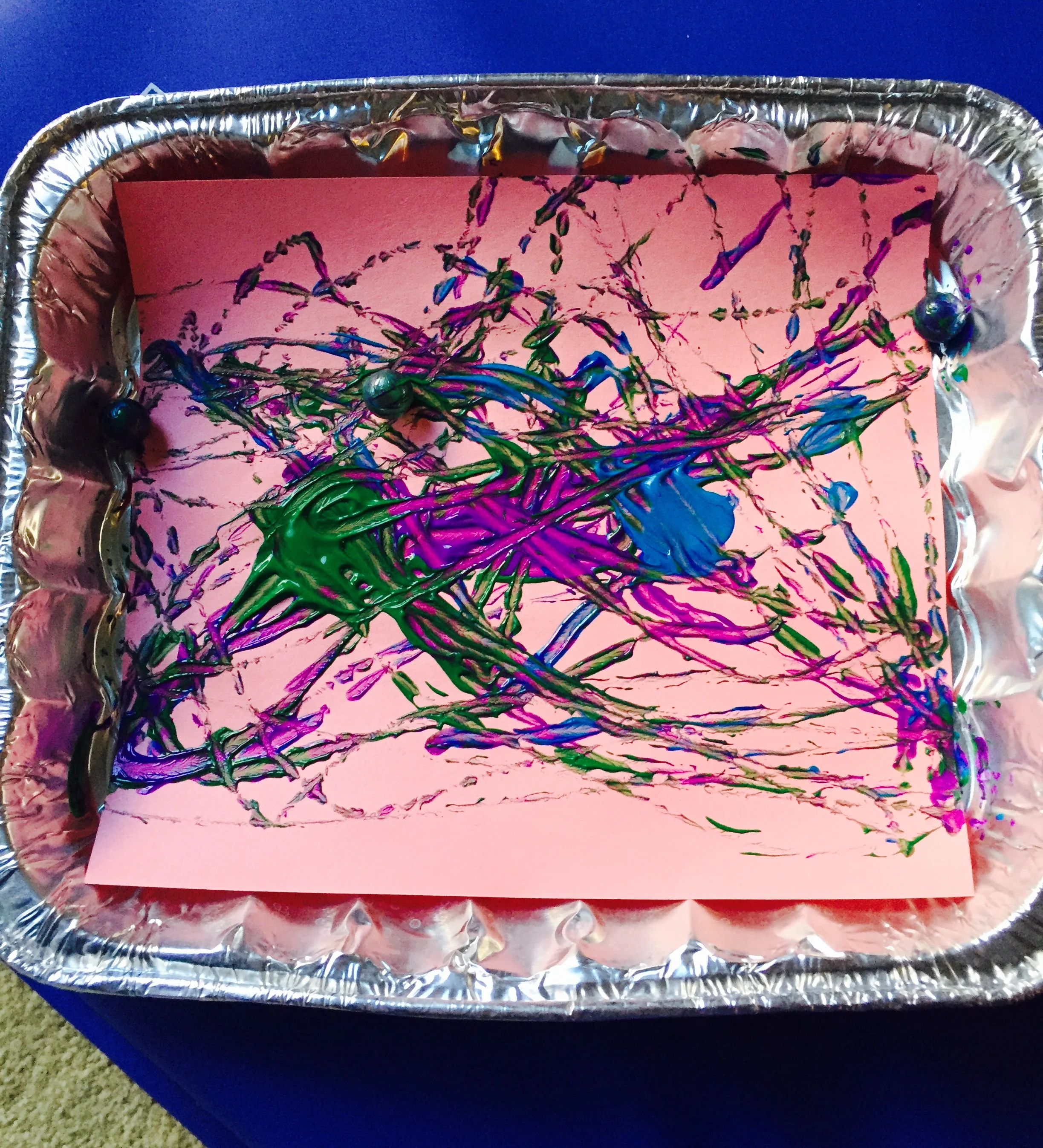 After you place the paper in the tray and add your paint and marbles, you hand the tray to your child and let them gently use both their hands to tip the tray from side to side so that the marbles mix with the paint and create art! Remember, the trick is to control your movements and coordinate both arms to keep the marbles in the tray!