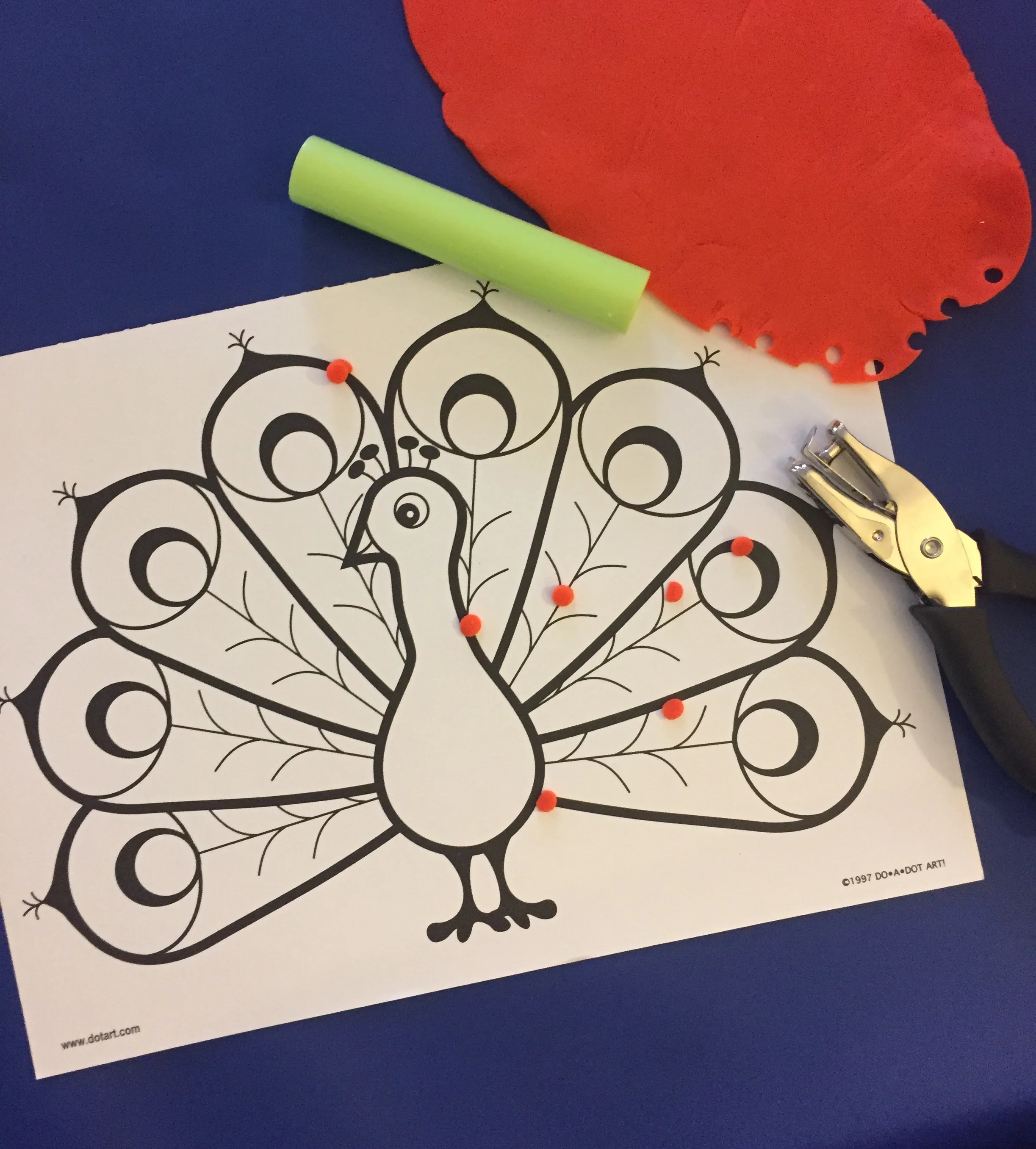 To hole punch play doh, all you need is play doh and a hole puncher. The trick is to roll out the play doh so it is super thin (a great way to practice bilateral coordination!). Once the play doh is thin, start punching!