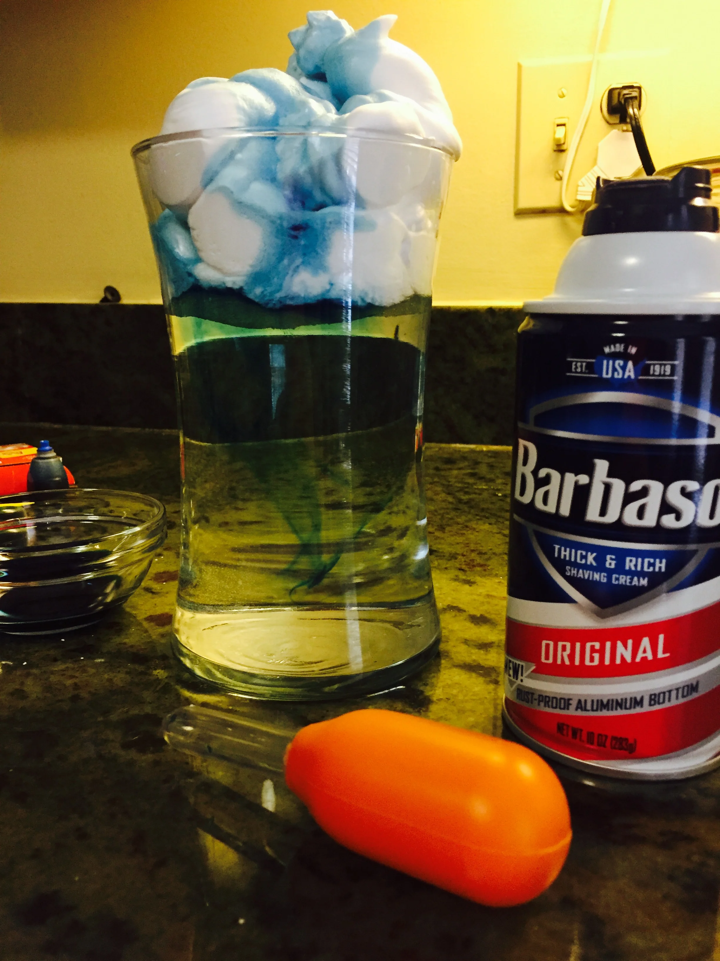 Here's a fun way to add eye droppers into play! Grab a glass cup or jar (I used a vase) and fill it with water. Next take some shaving cream (I buy the cheapest stuff at Target) and squirt the shaving cream on top of the water. And there you have yourself a rain cloud! Now comes the fun part. Take some food coloring, you can use any color, and mix it in with water. For the final step, grab an eye dropper, fill it with the food coloring and drop the food coloring on top of the rain cloud. After a few drops and some wait time (1-2 minutes) you'll start to see the food coloring below the cloud and in the water!
