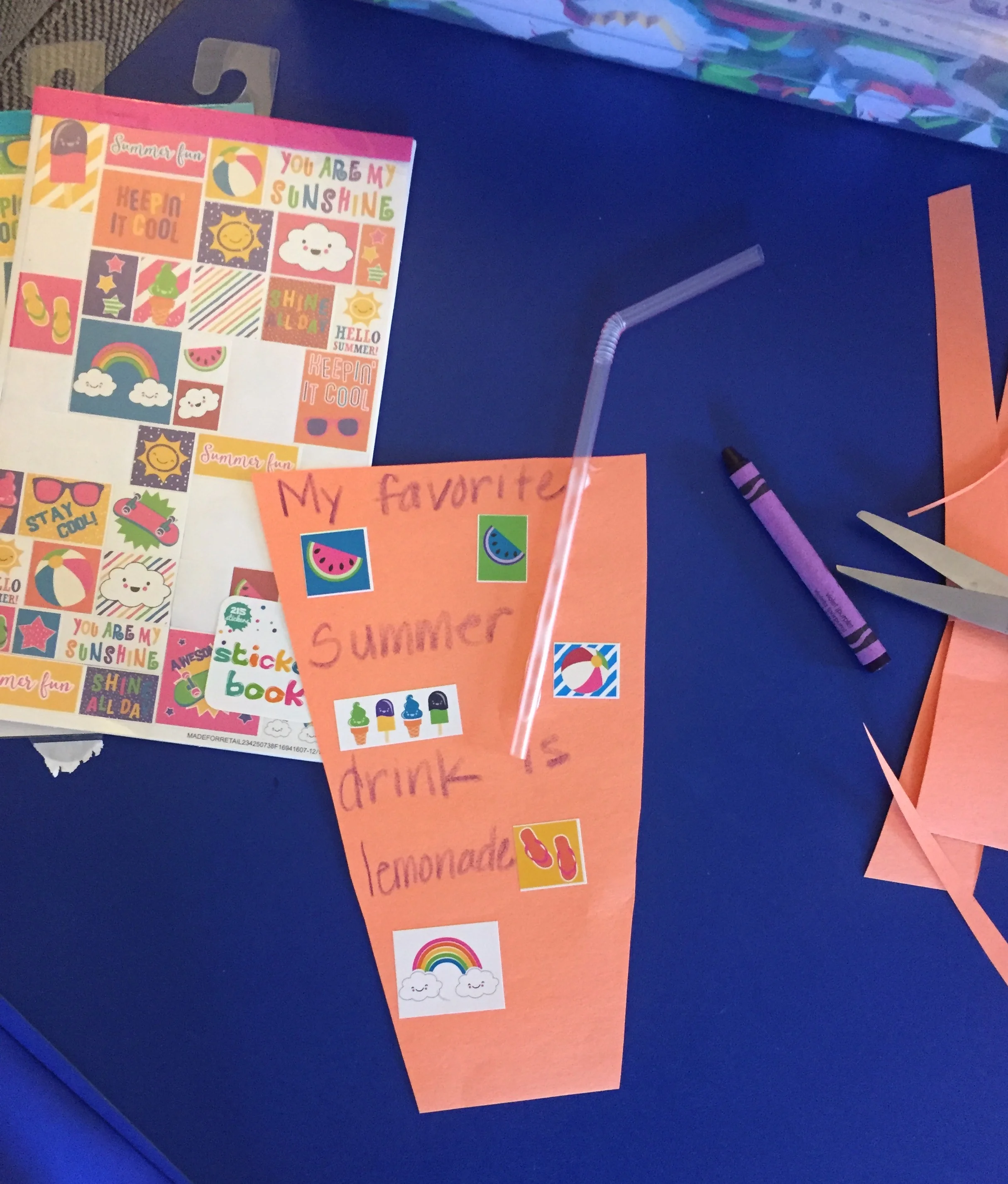 This is a great activity to continue to work on scissor skills, fine motor manipulation skills, and writing skills during the summer. To make this craft, first you have to cut out the cup, and this can be whatever color paper you would like. Be sure to add some guidelines to practice fine motor control! Next you decorate! Now I used stickers to work on fine motor manipulation, however you can use whatever you'd like (ex. markers, crayons, paint, etc...). Last, I wrote down my favorite summer drink!