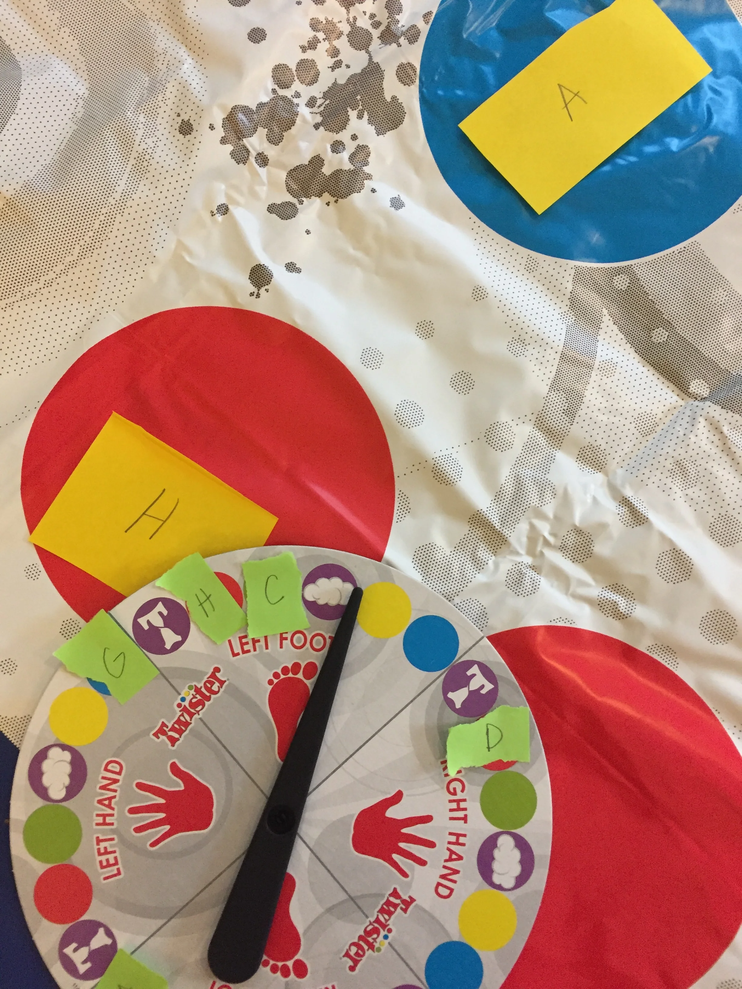 In this picture I'm using only upper case letters, however you can use sight words, lower case letters, and numbers. Whatever you would like your child to review this summer! To play this game, simply substitute the colors on the Twister spin board and playing mat with your desired lesson. Instead of matching colors, your child will be recognizing letters, numbers, or sight words!