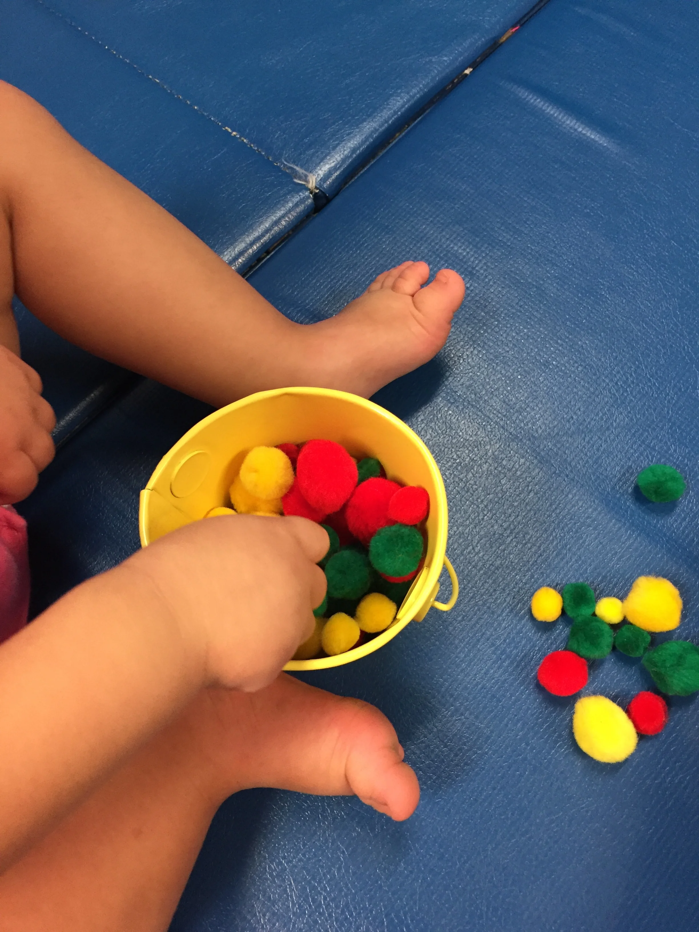 Today's activity can span all ages. I picked out some green, yellow, and red poms and pretended they were apples. I then put them in a bucket and depending on the age the task varied.