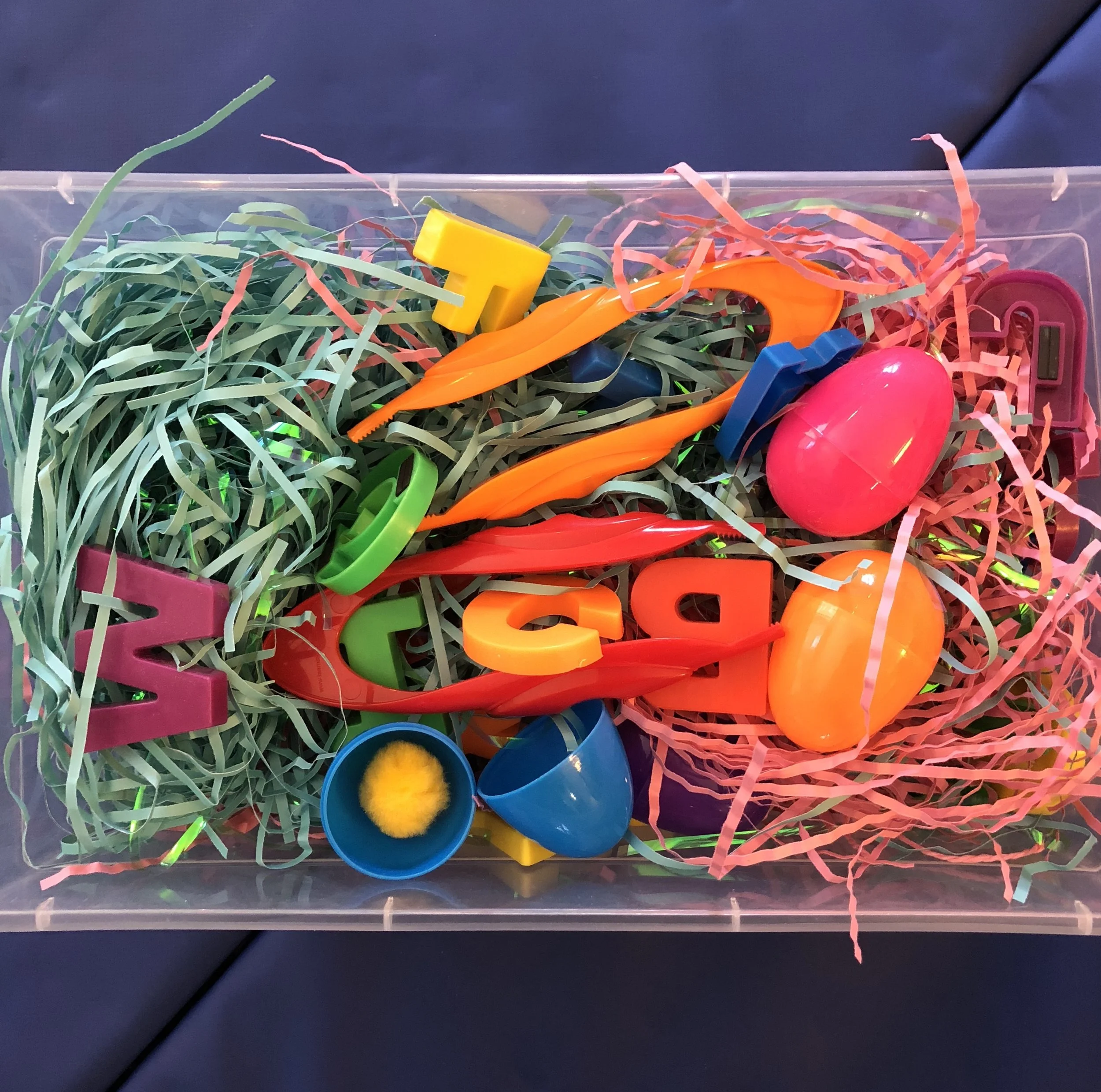 If you have any basket stuffing at your house, then you have the perfect sensory box material! In my sensory box I put plastic eggs, magnetic letters, and tongs, but you can fill yours however you wish! This box will focus on bilateral coordination (opening the eggs), hand strength and manipulation (tongs), and letter recognition!