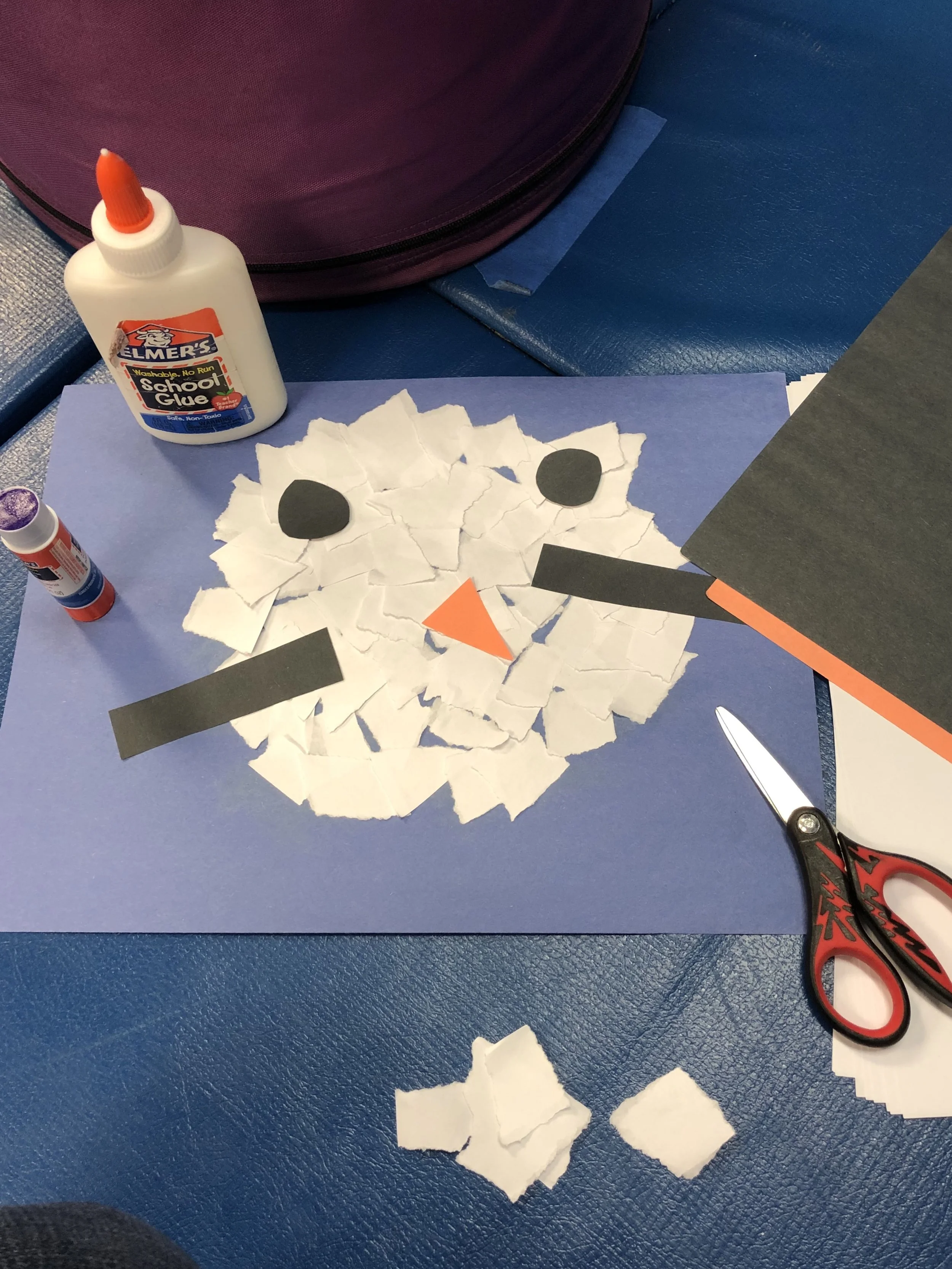 First rip up some white paper, I used computer paper. Then glue it down on a piece of paper and add whatever features you would like. For the younger kiddos I had the eyes, nose, and arms precut, however your older kiddos can cut out their own snowman details. For the even older kiddos, Kindergarten and older, you can write a quick sentence or two about why/how the snowman melted!