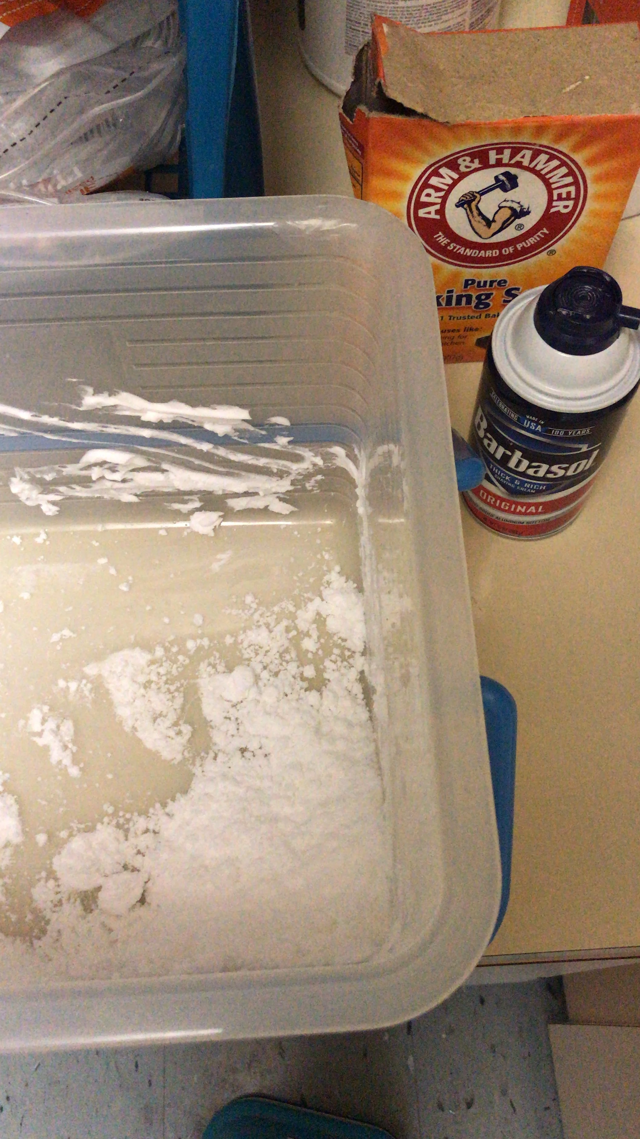 All you need to do is mix a cup of regular old shaving cream and a cup of baking soda in a container and you’re set! Feel free to add a few drops of water to really get the consistency that you’re looking for! As always, we suggest you put a large sheet under the container to catch any mess that may be made:).